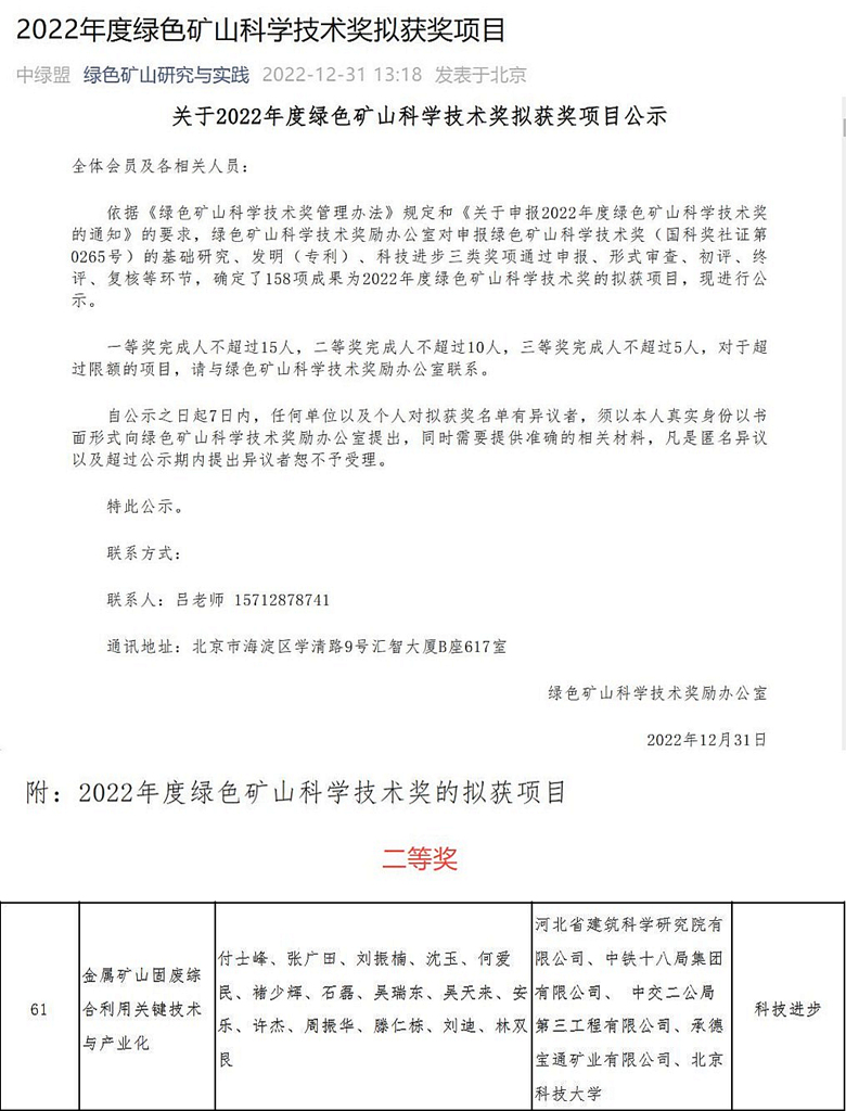我公司申報(bào)的“金屬礦山固廢綜合利用關(guān)鍵技術(shù)與產(chǎn)業(yè)化”項(xiàng)目依據(jù)《綠色礦山科學(xué)技術(shù)獎(jiǎng)管理辦法》規(guī)定和《關(guān)于申報(bào)2022年度綠色礦山科學(xué)技術(shù)獎(jiǎng)的通知》的要求,經(jīng)綠色礦山科學(xué)技術(shù)獎(jiǎng)勵(lì)辦公室對(duì)申報(bào)綠色礦山科學(xué)技術(shù)獎(jiǎng)(國(guó)科獎(jiǎng)社證第0265號(hào))的基礎(chǔ)研究、發(fā)明(專(zhuān)利)、科技進(jìn)步三類(lèi)獎(jiǎng)項(xiàng)通過(guò)申報(bào)、形式審查、初評(píng)、終評(píng)、復(fù)核等環(huán)節(jié),確定我公司申報(bào)的“金屬礦山固廢綜合利用關(guān)鍵技術(shù)與產(chǎn)業(yè)化”榮獲2022年度綠色礦山科學(xué)技術(shù)獎(jiǎng)二等獎(jiǎng)。