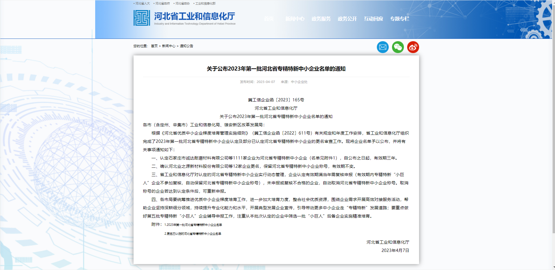 2023年4月7日,河北省工業(yè)和信息化廳發(fā)布《關(guān)于公布2023年第一批河北省專精特新中小企業(yè)名單的通知》,河北冀科工程項(xiàng)目管理有限公司被認(rèn)定為2023年“專精特新”中小企業(yè)。