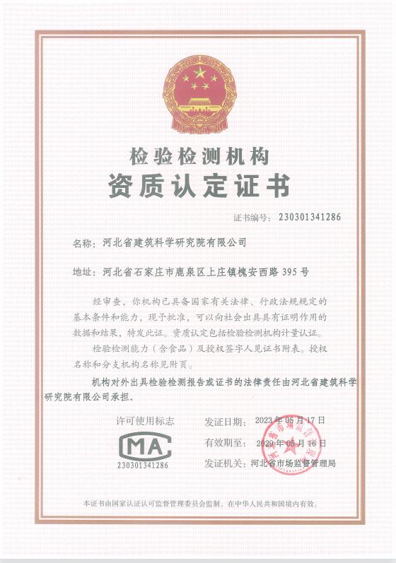 河北省建筑工程質(zhì)量檢測中心認證證書1