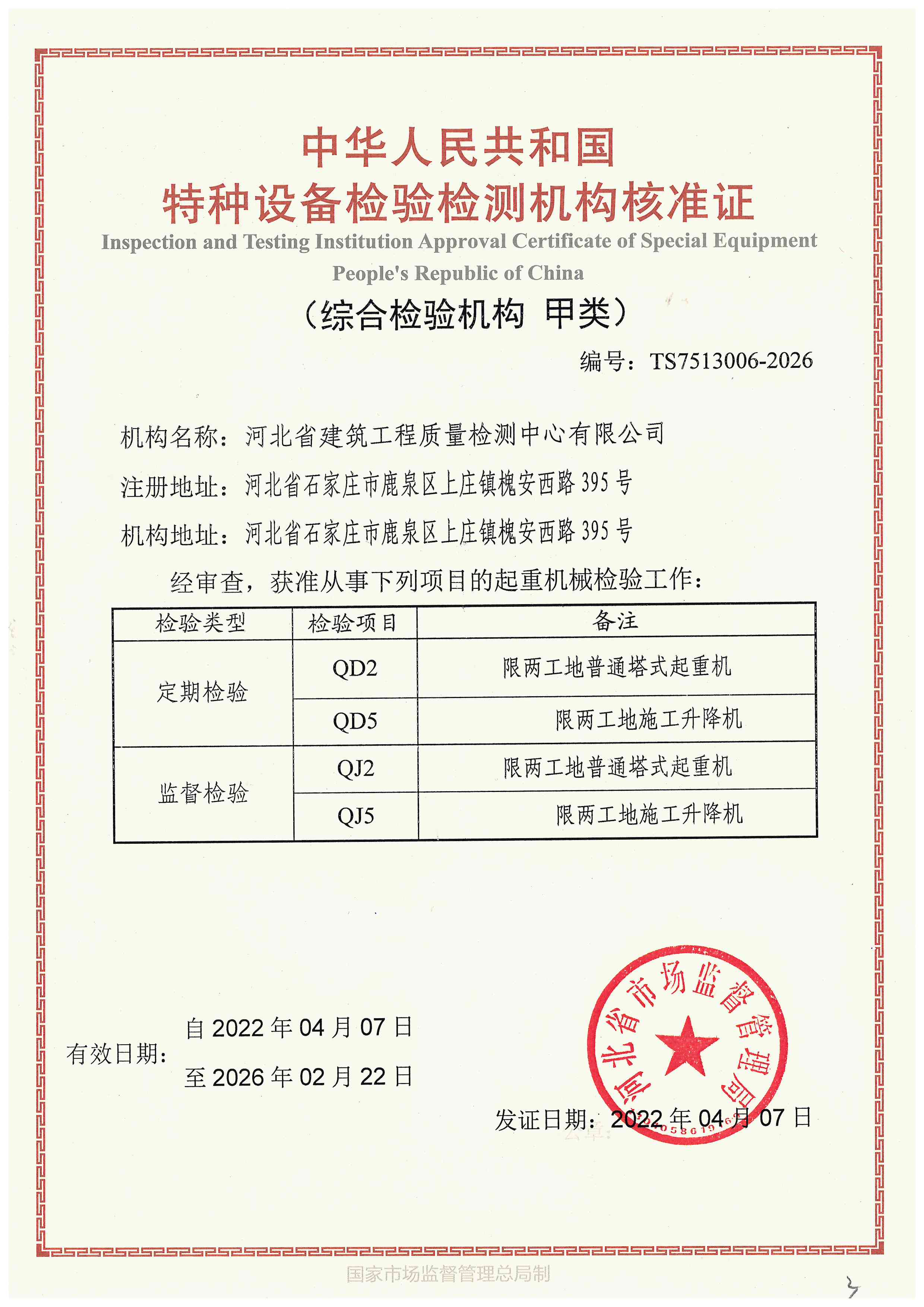 河北省建筑工程質(zhì)量檢測中心特種設(shè)備檢驗檢測機構(gòu)核準證